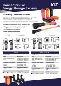 350A Item Number Plug CESF-350A-BK/RE/OR Receptacle CESMC-350A-BK/RE/OR CESMS-350A-BK/RE/OR CESMB-350A-BK/RE/OR Conductor cross-section 3/0 AWG 4/0 AWG Nominal current 3/0 AWG Max. 300A 4/0 AWG Max. 350A (Crimp) Nominal Voltage 1500V Degree of protection IP67 Colors Certification UL4128、TUV 2 PfG 2740 Black / Red / Orange 450A / 500A Item Number Plug CESF-450A-BK/RE/OR CESF-500A-BK/RE/OR Receptacle CESMC-450A / 500A-BK/RE/OR CESMS-500A-BK/RE/OR CESMB-500A-BK/RE/OR Conductor cross-section 300K cmil 350K cmil Nominal current 300K cmil Max. 450A 350K cmil Max. 500A (Crimp) Nominal Voltage 1500V Degree of protection IP67 Colors Certification UL4128、TUV 2 PfG 2740 Black / Red / Orange (Plug) (Receptacle) (Receptacle) (Plug) 37mm 44.3mm 113mm 33mm 44.3mm 106.4mm 46mm 46mm CESMC-350A 80.6mm CESMS-350A 69.1mm CESMB-350A 78.8mm CESMB-500A 82.8mm 46mm 46mm 80.8mm CESMC-450A/500A 70.8mm CESMS-500A ‧Crimp Termination ‧Busbar ‧Screw Fastener www. kstermi na l s . com